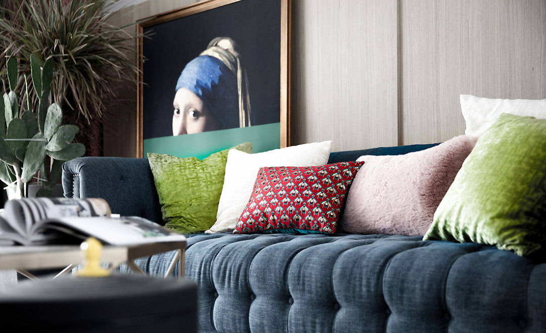 ▲ 深藍色美式沙發(fā)承載著浪漫與優(yōu)雅,色澤明快而又溫柔的抱枕隨意傾靠,帶來柔和清爽的視覺感。
