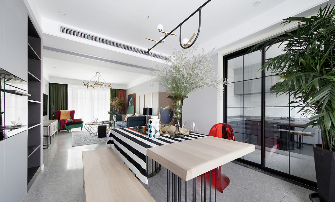 ▲ 餐廳采用了木質(zhì)長凳加透明單椅的組合,既節(jié)約空間,相對來說也更輕松隨性。吊燈、桌腿和廚房推拉門等多采用了黑色線條勾勒,耐看脫俗一目了然。