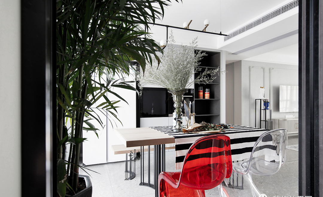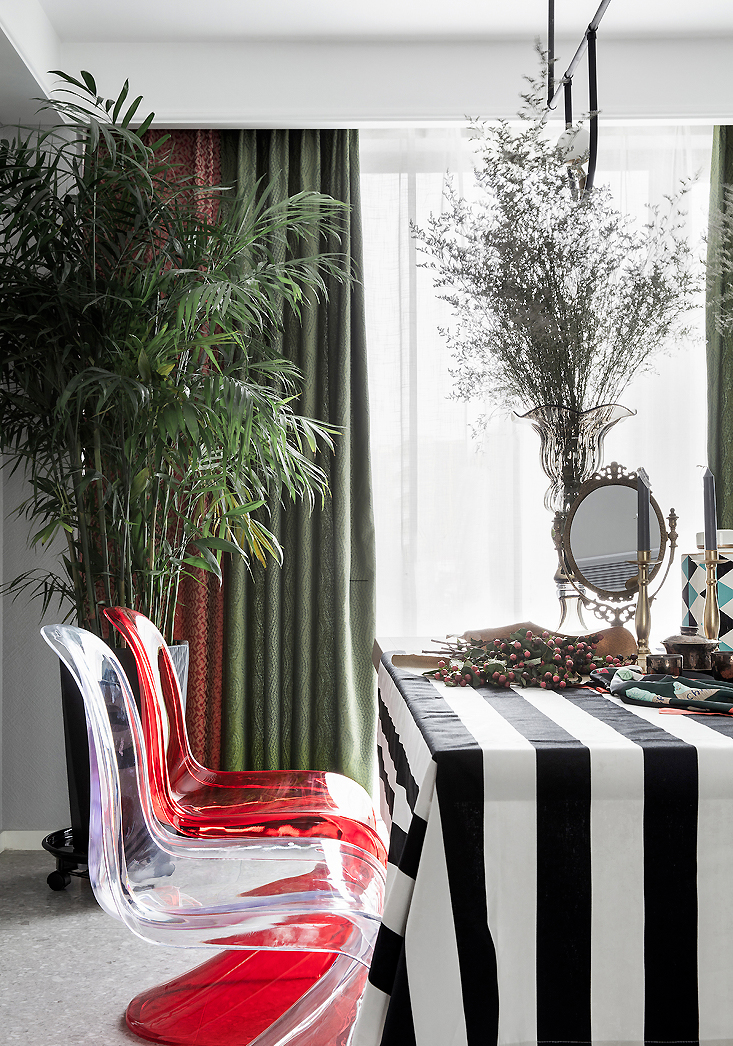 ▲ 紅色、白色透明質(zhì)感的單椅,搭配黑白條紋的桌布,極具現(xiàn)代感。