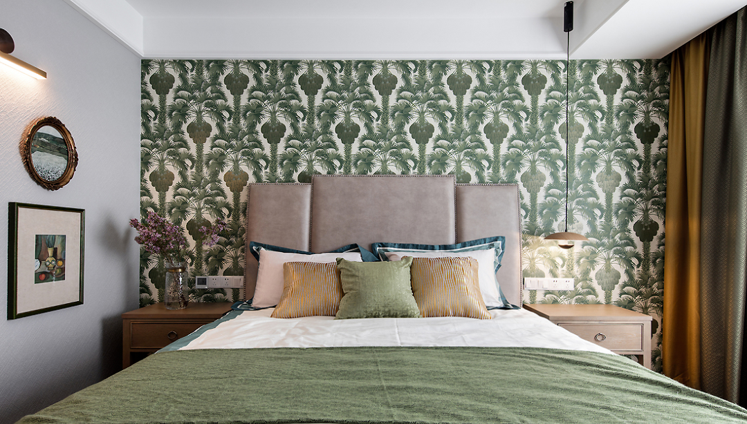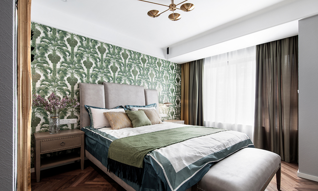 ▲ 主臥,綠植圖案的背景墻加以金色抱枕的點綴,與窗簾色調(diào)相呼應(yīng)。人字形地板鋪貼,在視覺上有拉伸空間的效果,增添優(yōu)雅高級的質(zhì)感。