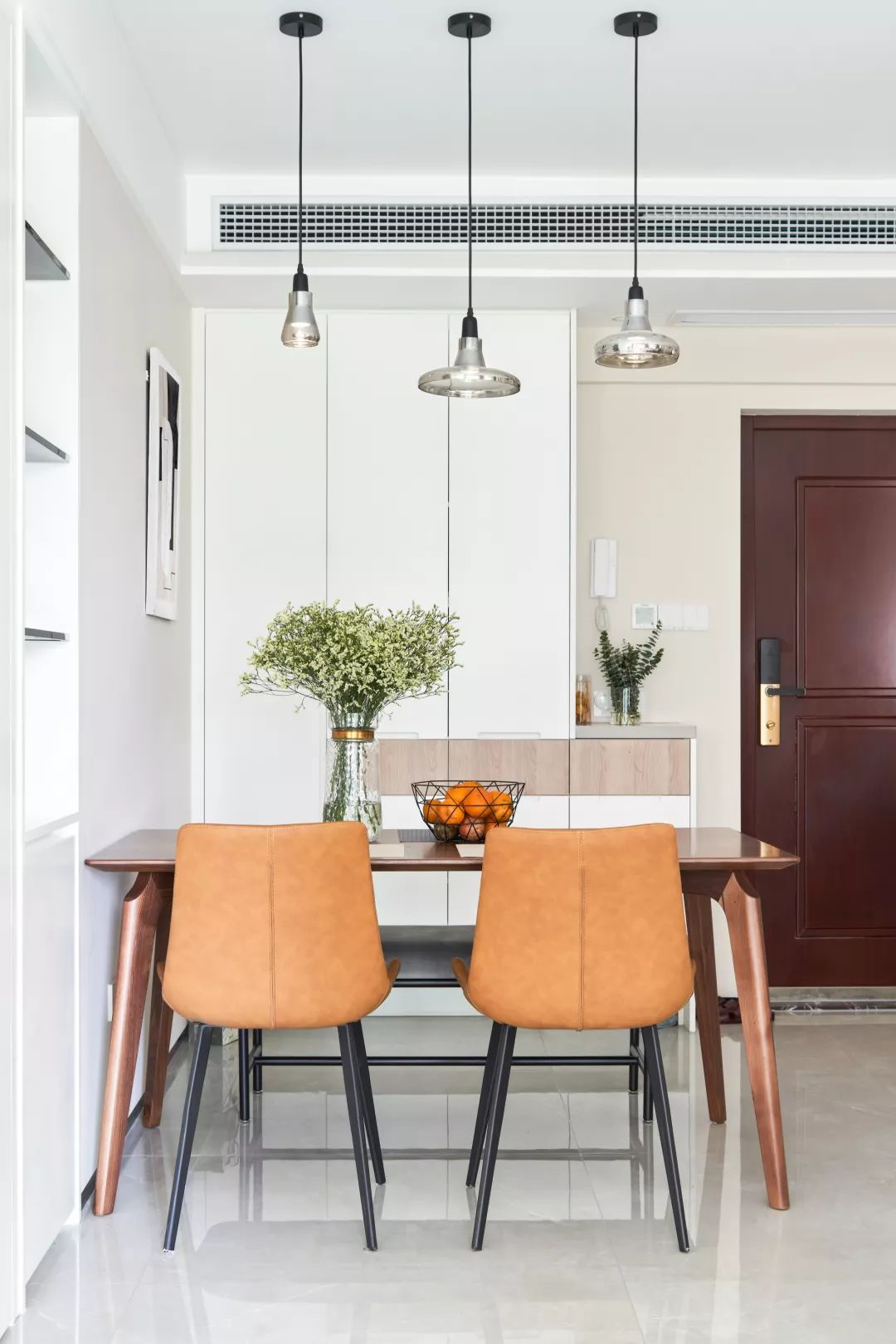 ▲入戶沒(méi)有玄關(guān)走廊的戶型,直接在入戶門側(cè)方的墻面做柜子,把餐邊柜和鞋柜給結(jié)合起來(lái),兩者合一也能節(jié)約一些空間。