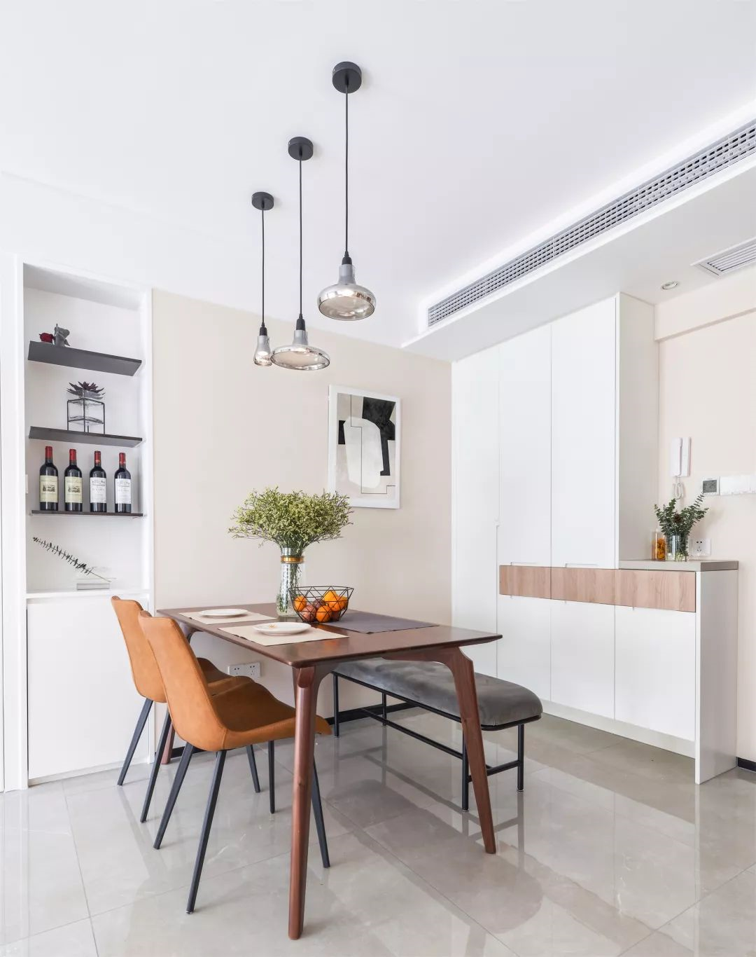 ▲餐廳的墻面刷成了藕粉色,在白色的柜子當(dāng)中加入了木色作為點(diǎn)綴。餐廳的另一側(cè)還做了部分的嵌入式柜子,作為一個(gè)小酒架。