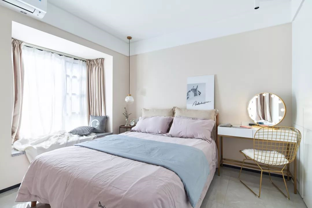 ▲主臥室的墻面同樣是選擇了藕粉色,搭配粉色的床品和部分的藍(lán)色作為點(diǎn)綴,整個(gè)空間看起來(lái)優(yōu)雅浪漫而又清新舒適。