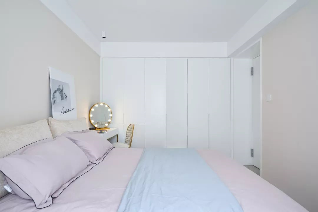 ▲在臥室的另一側(cè)是嵌入式的衣柜,衣柜的邊上擺放一個(gè)梳妝臺(tái),整體白色的柜子加上金屬元素的椅子、鏡子,看起來(lái)也非常精致。