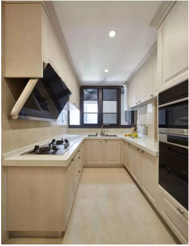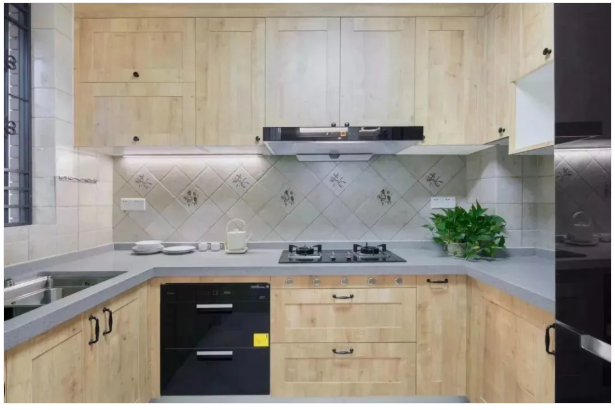 而在中式、美式等風(fēng)格的廚房,則可以選擇實木的櫥柜門板,整體效果更佳端莊高檔,適合有一定經(jīng)濟(jì)條件的家庭。