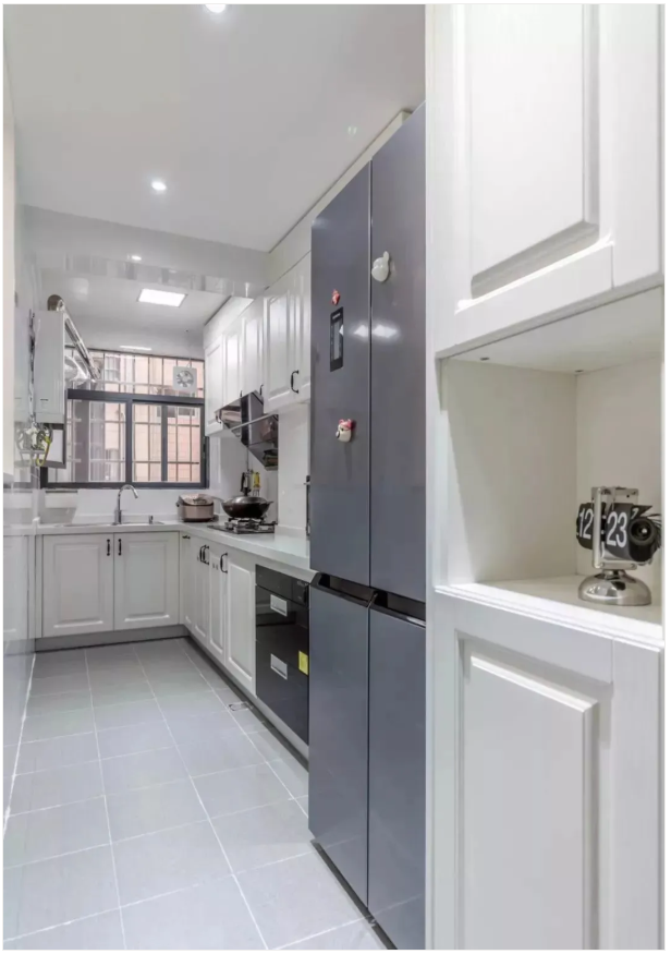 除了亞克力板,對于簡約現(xiàn)代風(fēng)格的廚房,選擇白色的普通板材,搭配上灰調(diào)或黑色,整體空間效果也是非常的簡約自然。