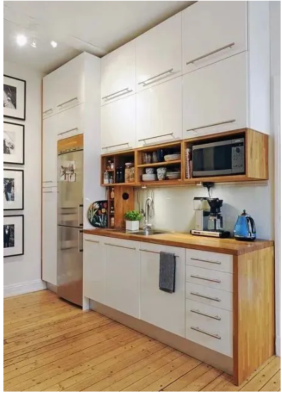 舉一反三,吊柜下部留空同樣可用。而且高度適中的開放式柜子,可以極大方便物品的取用,減輕廚房臺(tái)面的壓力。