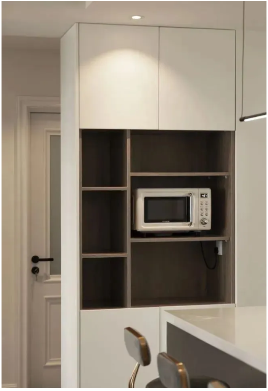 這一點(diǎn)也是考慮到小型電器在這里更方便操作,可以不費(fèi)力的取出、存放。相比于放在廚房臺(tái)面占地方或放入柜門中取用過程繁瑣,這一設(shè)計(jì)的確十分討喜。