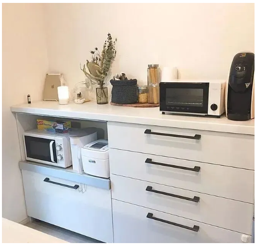 因此,我更建議在臺(tái)面和墻體的角落位置,做一個(gè)和臺(tái)面相接的柜子,把常用的電器收納于此。