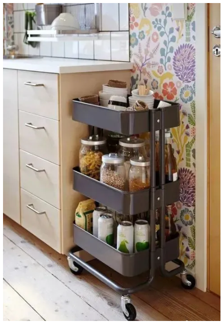 除了可以用地柜開放式的小格子存放物品,廚房里需要存放的臨時(shí)物品可不在少數(shù)。因此,小推車對(duì)于一個(gè)廚房來(lái)說,已經(jīng)逐漸變成了必需品。